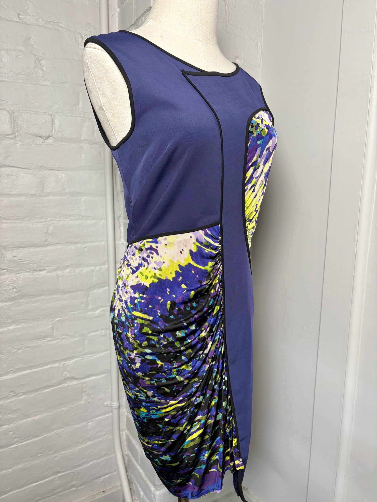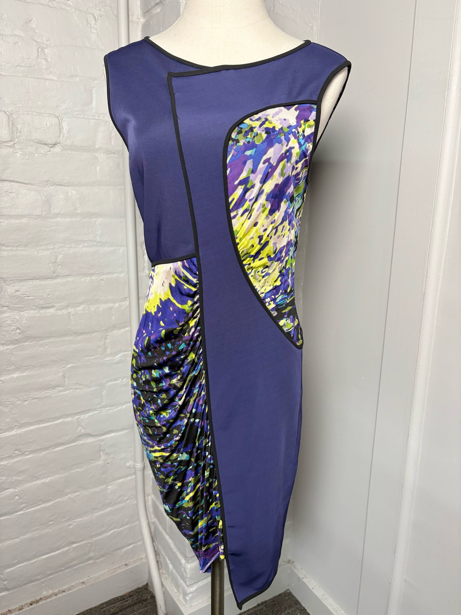 BCBG Max Azria purple, green, blue and purple abstract pattern asymmetrical midi dress that is sleeveless in a size extra small.