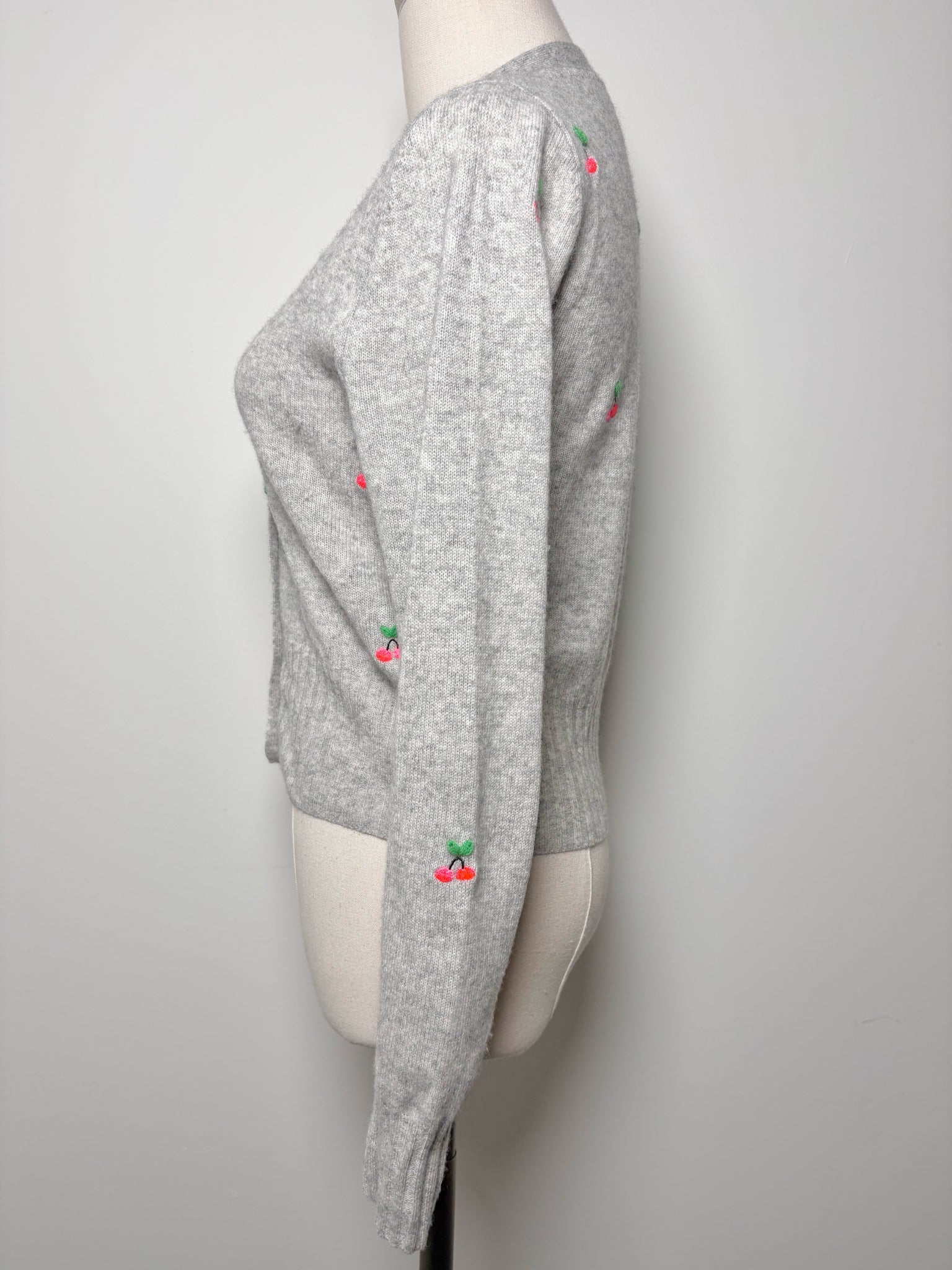 Brodie gray cropped cashmere cardigan sweater with neon pink cherries embroidered in a size extra small.