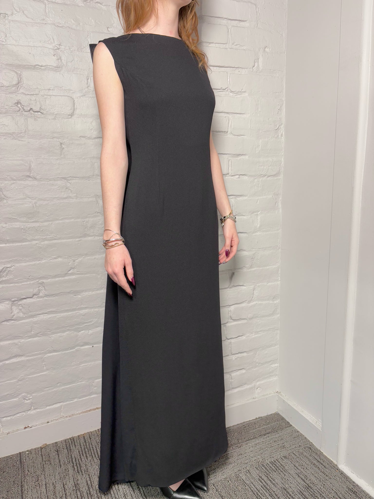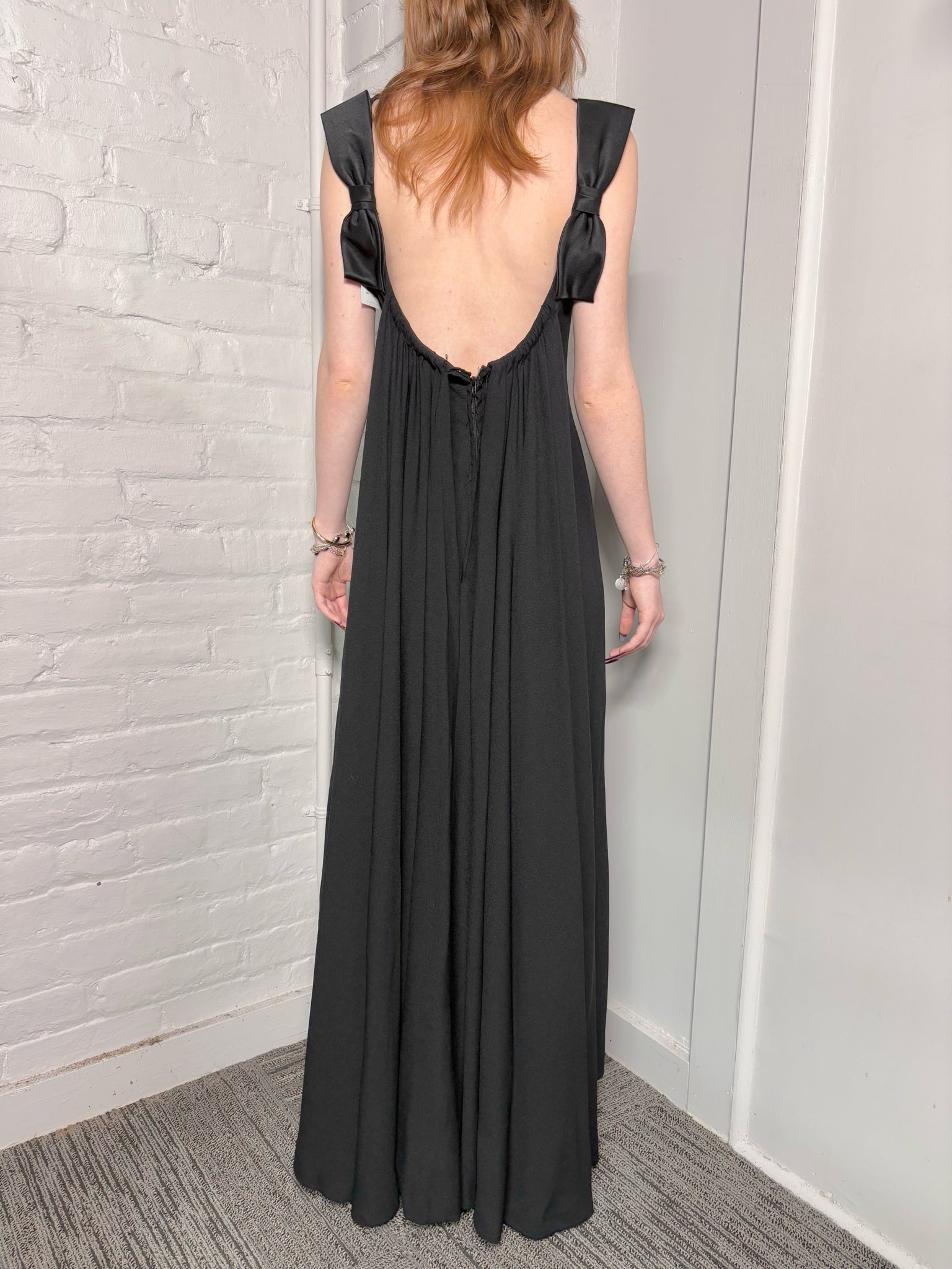 Vintage Balenciaga black low-back gown featuring an elegant sweeping train and two refined satin side bows. Estimated to fit an extra small, this rare piece captures the house’s signature couture drama with a striking, sculptural silhouette and timeless evening allure.