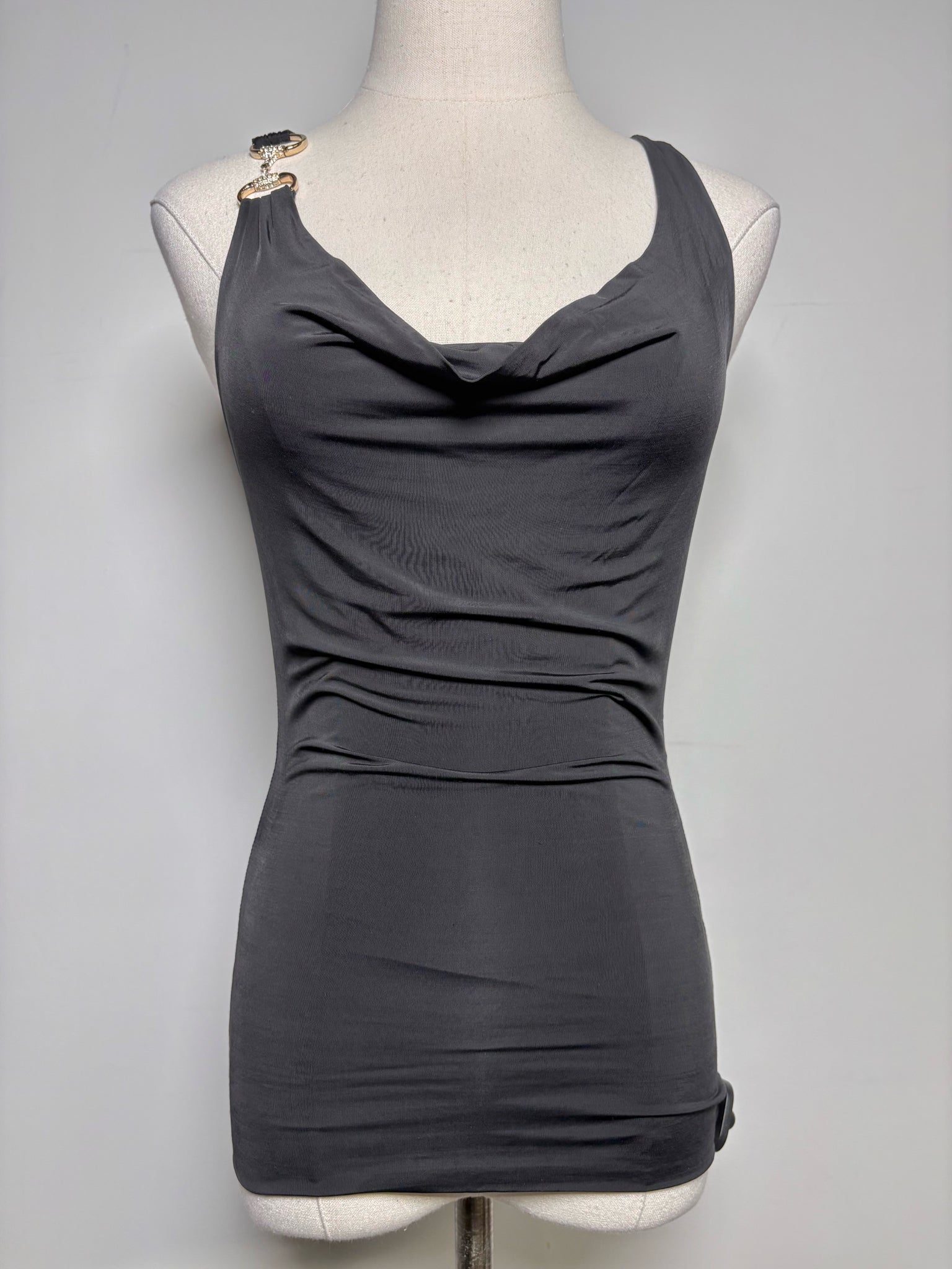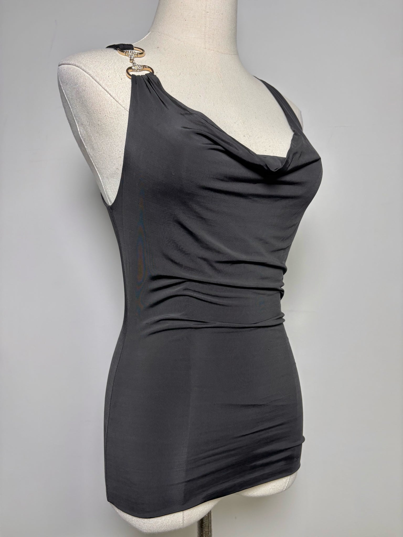 Sophisticated yet modern, this Gucci black knit stretch tank features a draped scoop neckline accented with the iconic horsebit detail embellished in faux crystals. A sleek, figure-flattering piece in size XS.