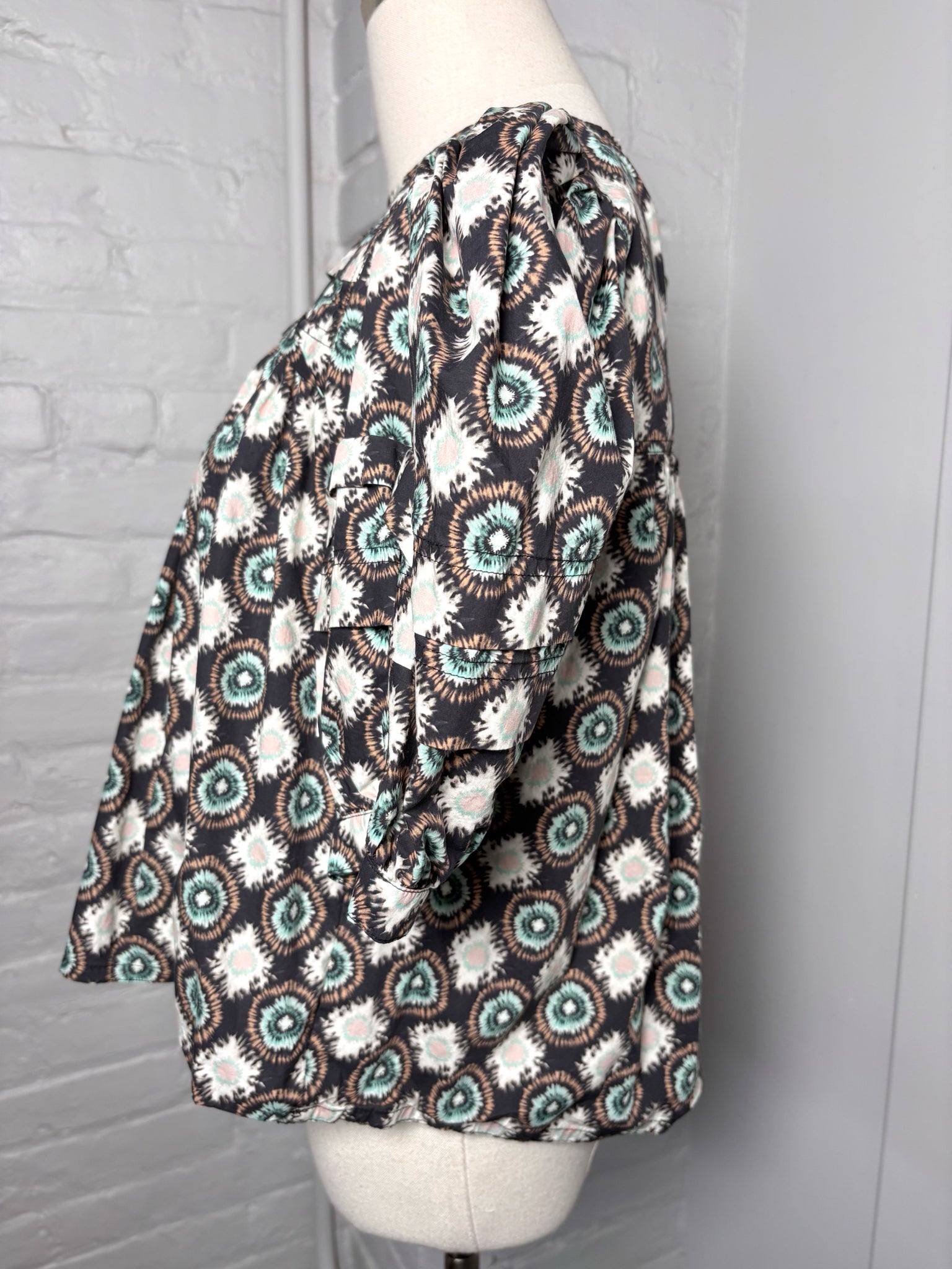 Hunter bell black, mint green and peach mini tie dye circles "baby doll" blouse with poof sleeves in a size extra small.
