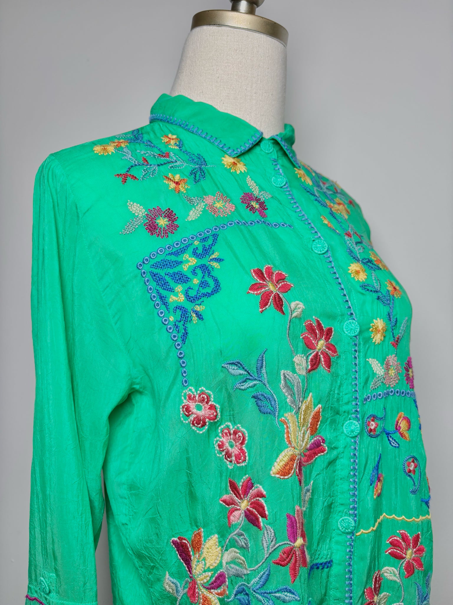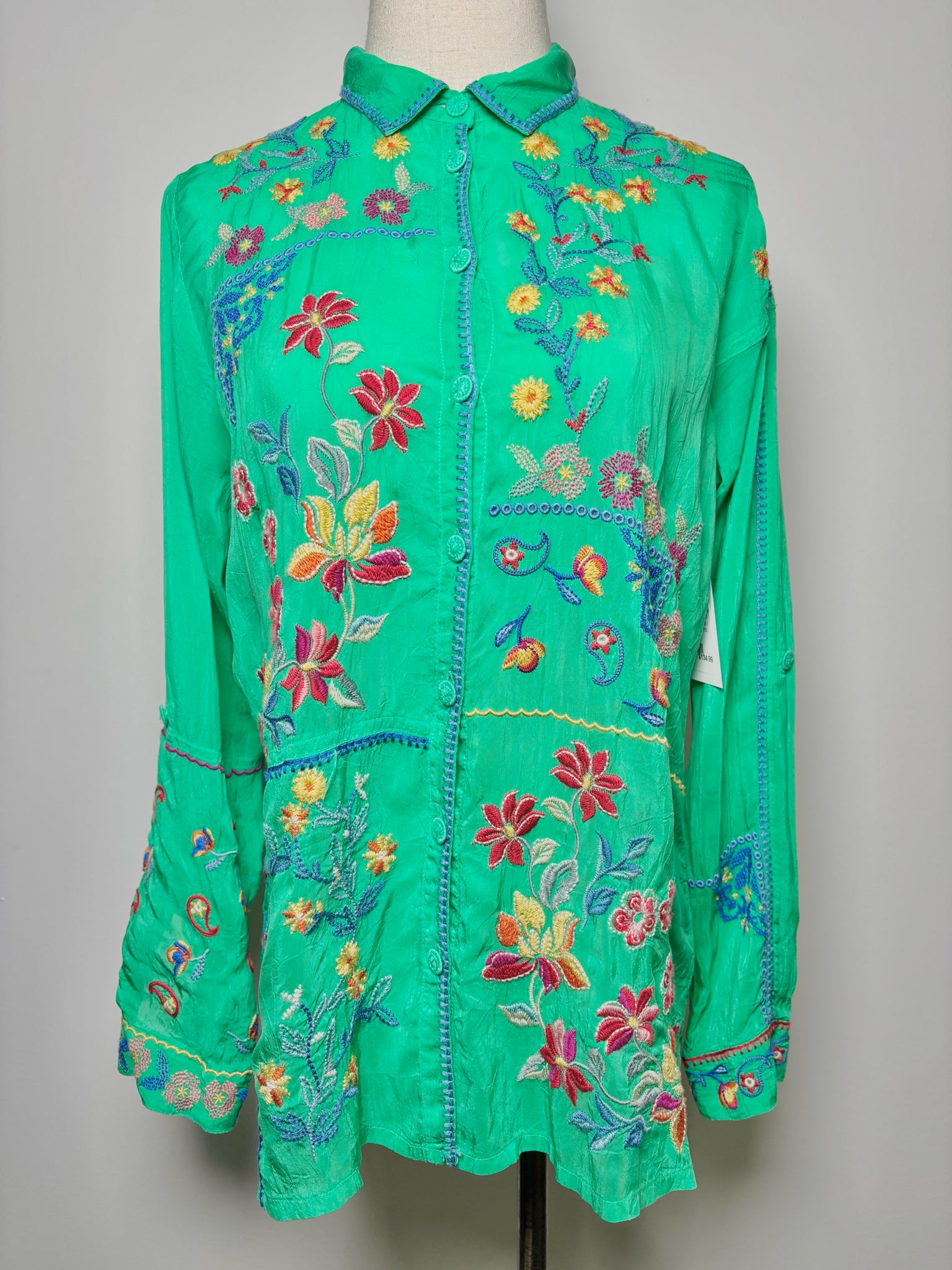 Johnny Was Green Floral Rayon Blouse — New with tags, this vibrant design features an allover floral print, long sleeves with roll-tab options, a flattering v-neckline, and tonal green button detailing. A relaxed yet polished piece with the brand’s signature bohemian charm. Pre-Owned.
