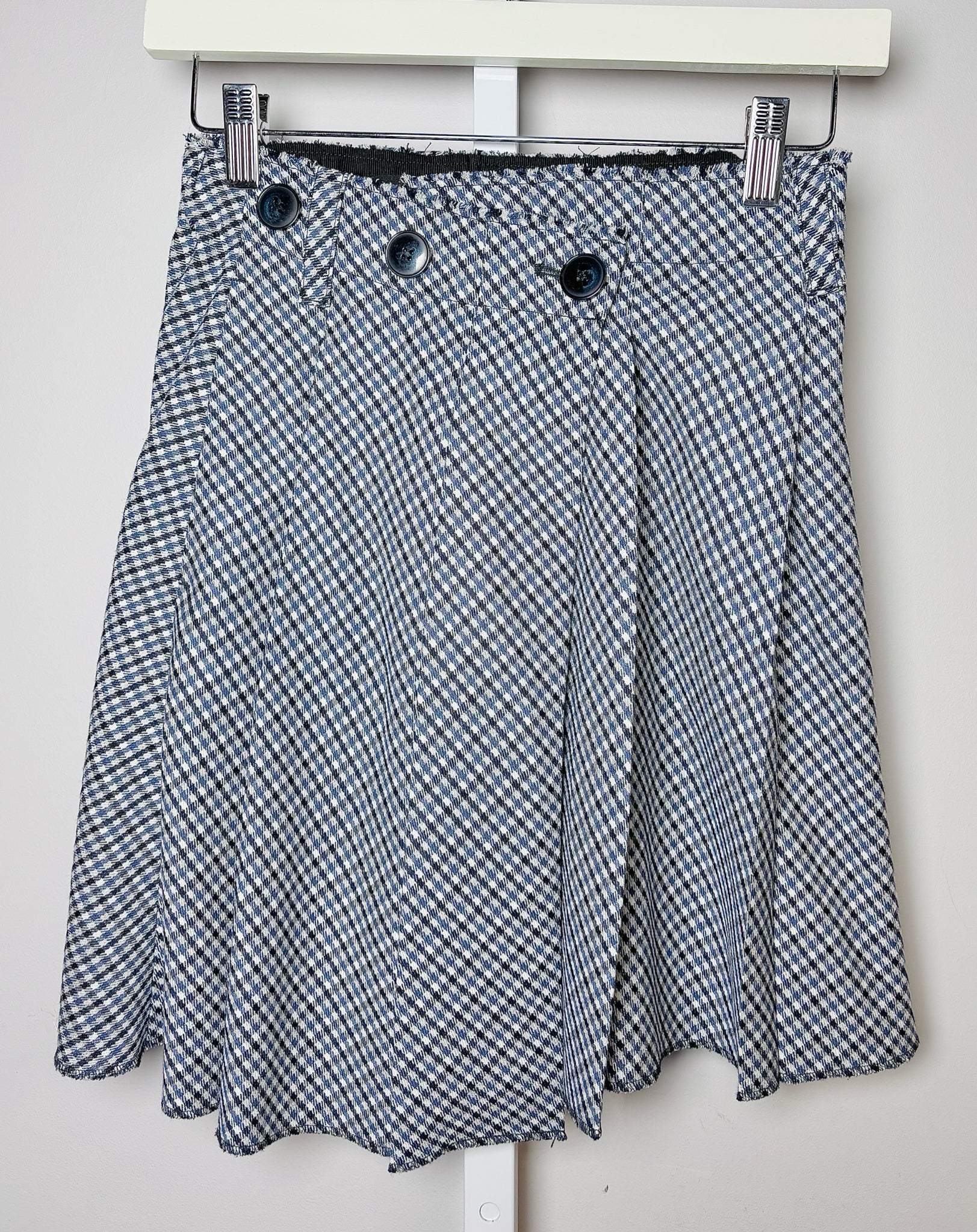 Maje blue, black and white houndstooth asymmetrical buttons pleated mini skirt in a size 34/XS. Pre-owned.