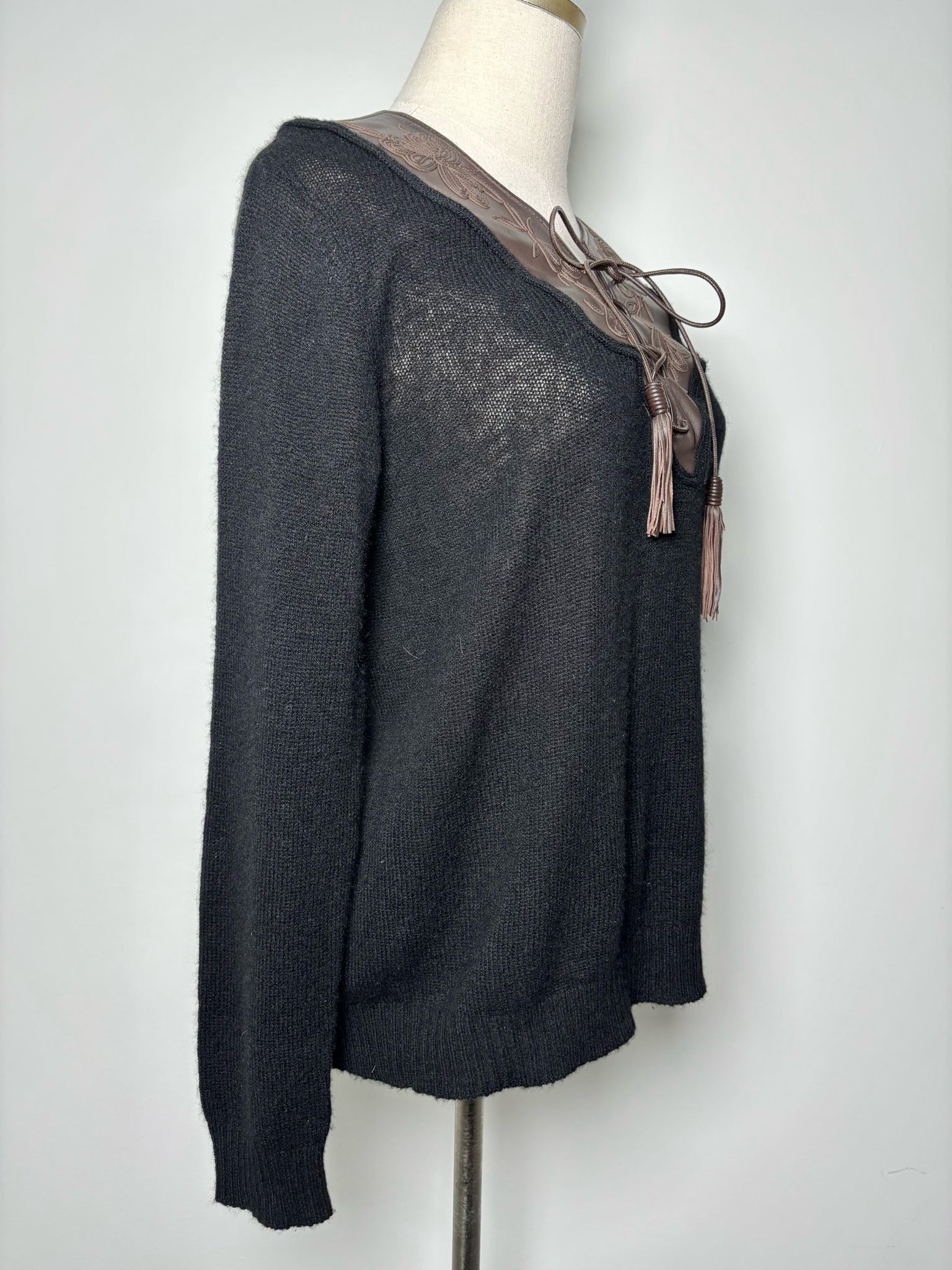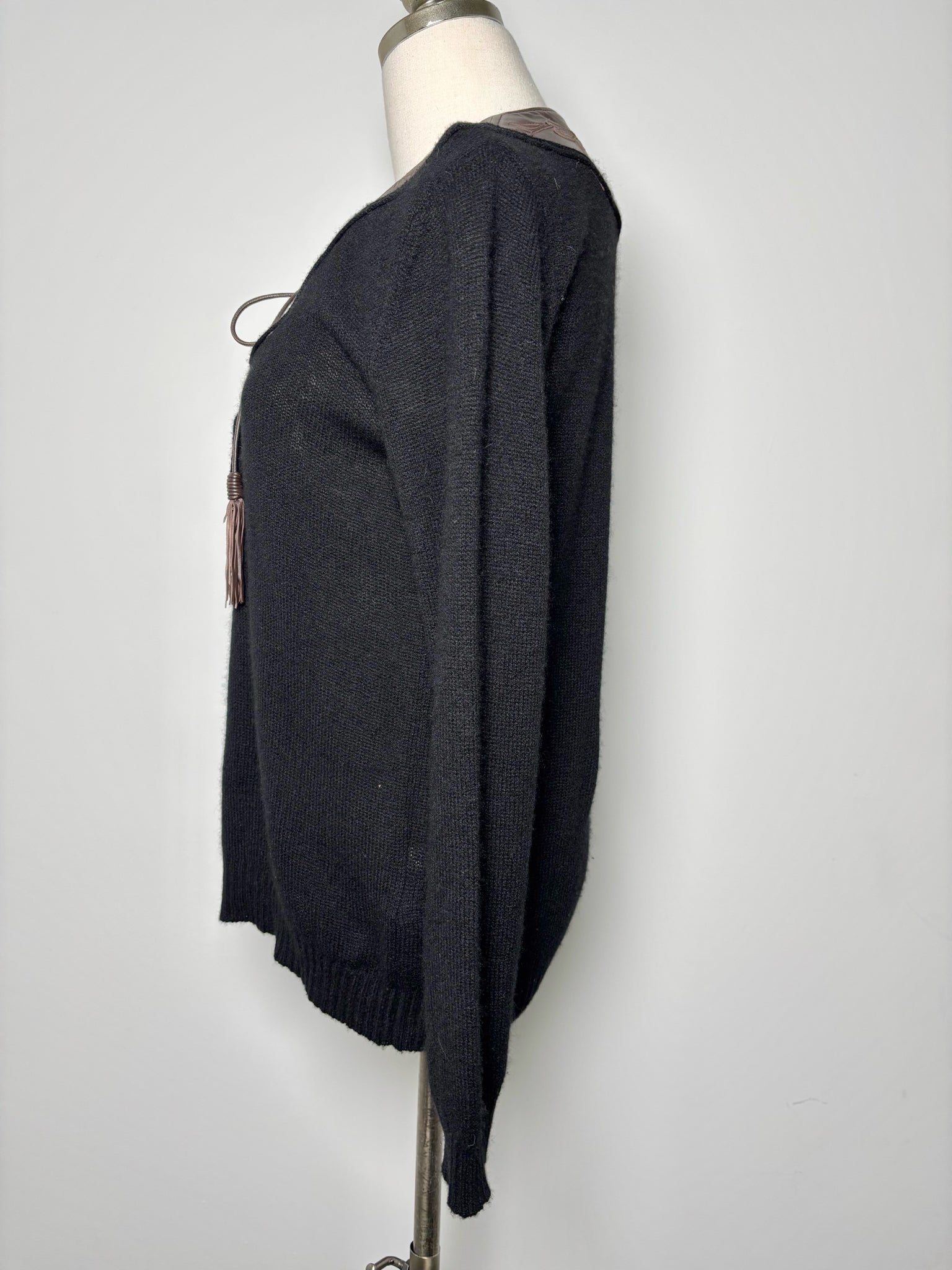 Ralph Lauren Purple Label Black Cashmere Knit Top with Brown Floral Leather Neckline – Size XS
