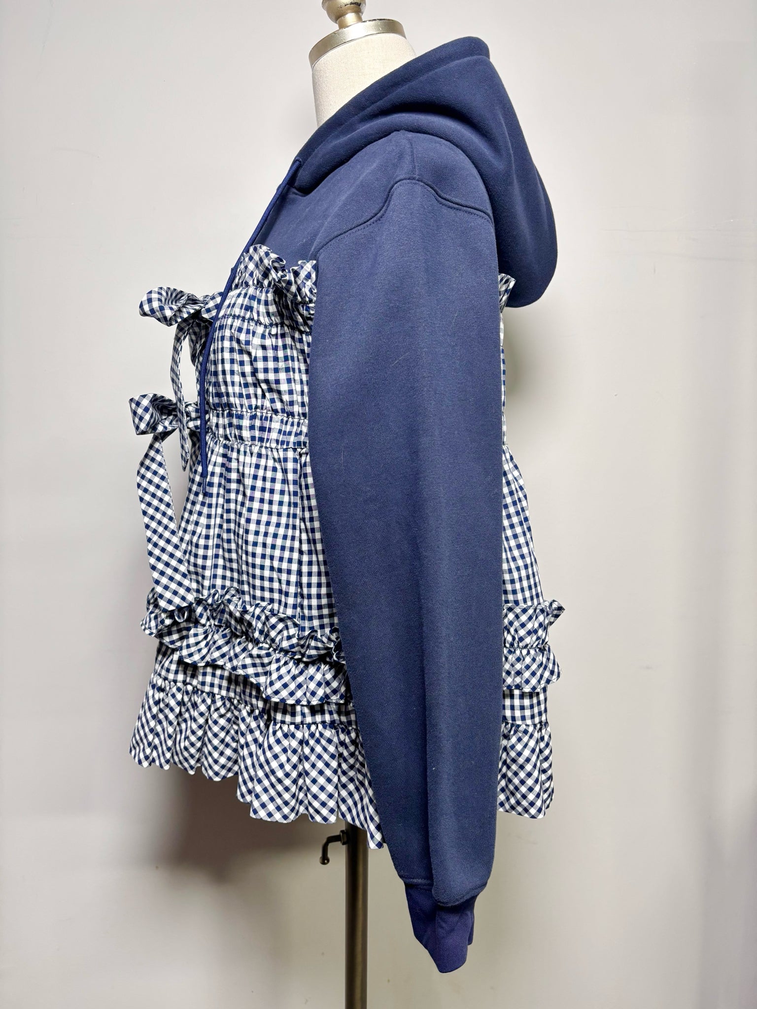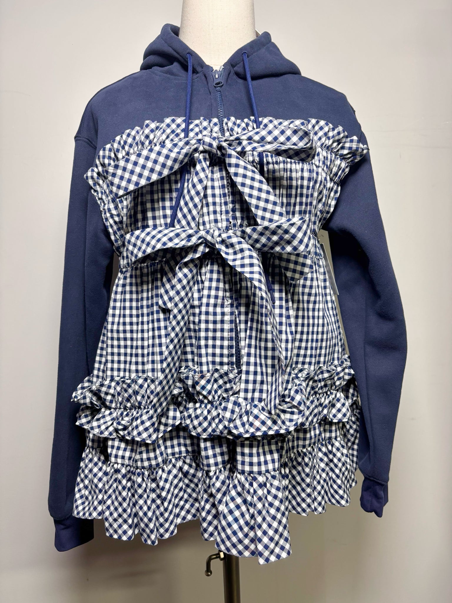 Sandy Liang blue fleece and gingham combo zip-up jacket in a size XS, showcasing the designer’s signature playful contrasts. Crafted with soft fleece, crisp gingham paneling, and charming ruffled accents, this standout piece brings whimsical texture and modern downtown edge to any cool-weather look.