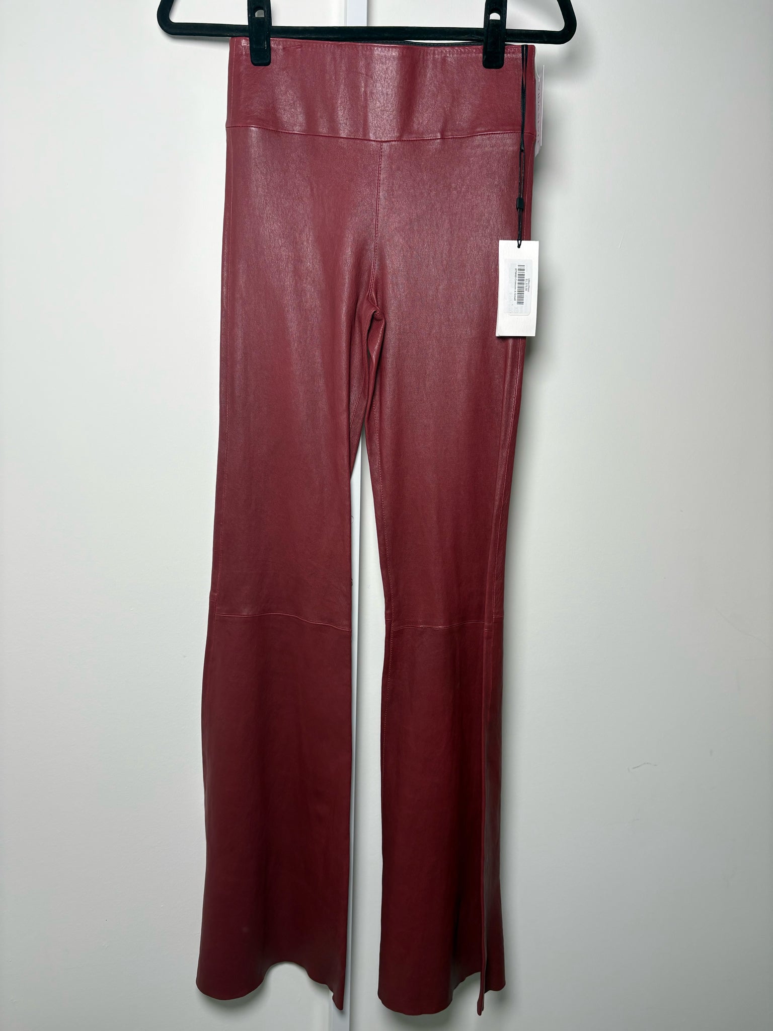 Sprwmn burgundy leather pull on flare leg pants with stretch in a size extra small. Comes new with tags.