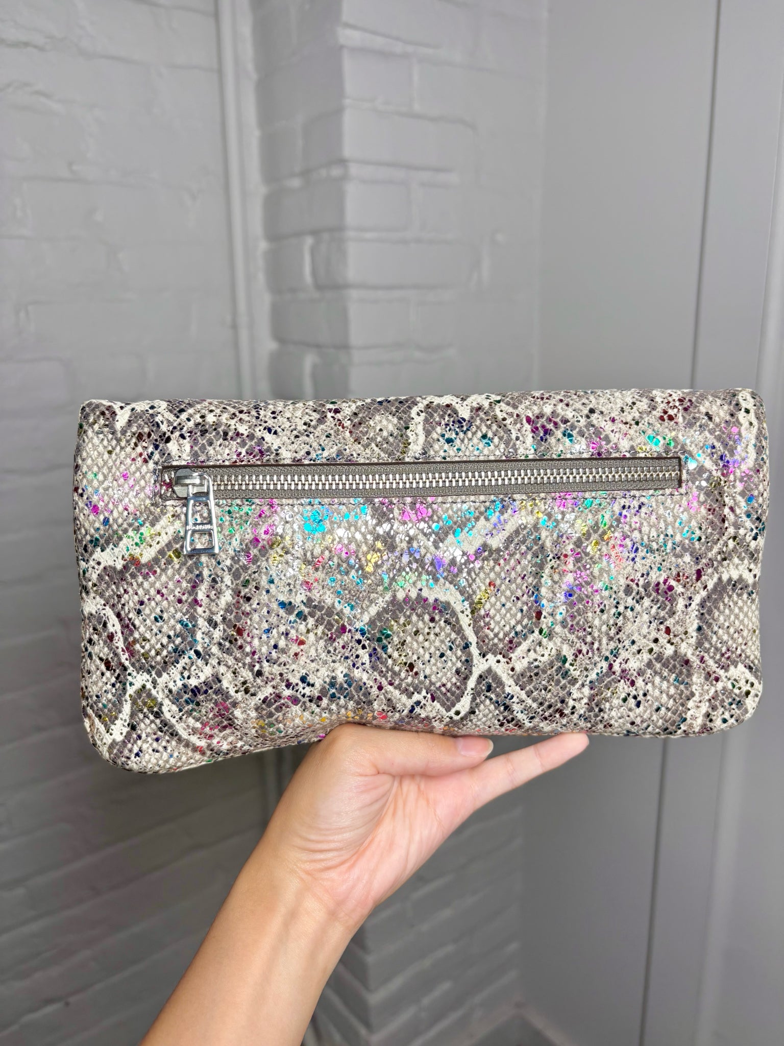Zadig & Voltaire gray snakeskin print with neon rainbow sparkles bi-fold purse. It has a detachable silver chain strap to wear as a purse or clutch. The inside has a fuchsia canvas lining.